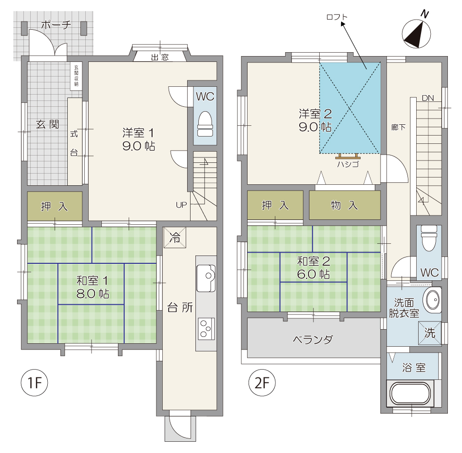 【間取り】1F:和室8帖,洋室9帖,台所 2F:和室6帖,洋室9帖,ロフト,浴室,洗面,トイレ