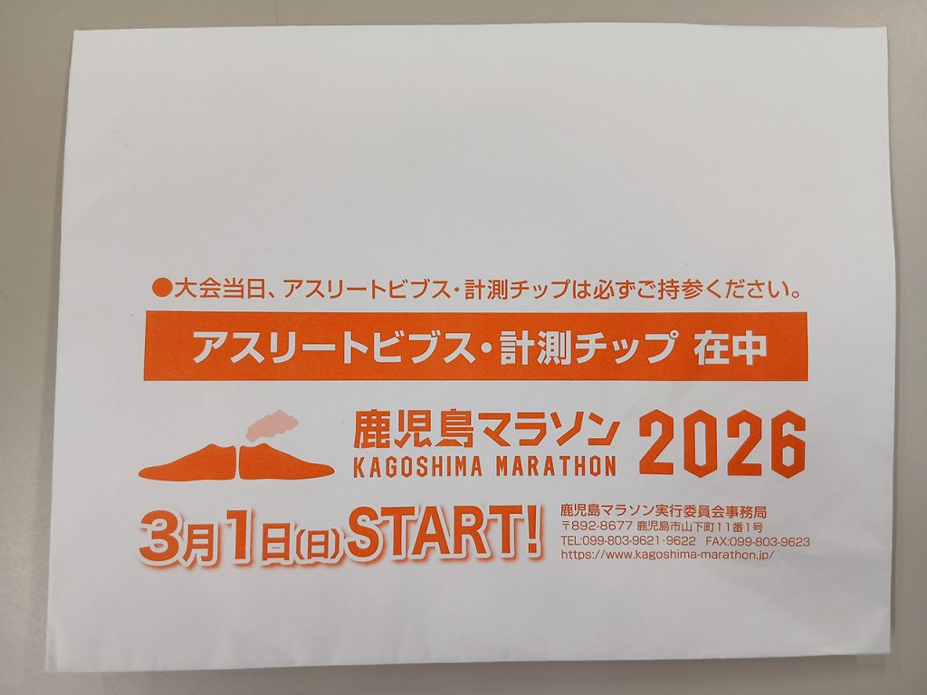 鹿児島マラソン事務局から届いた、ゼッケンと案内一式です。