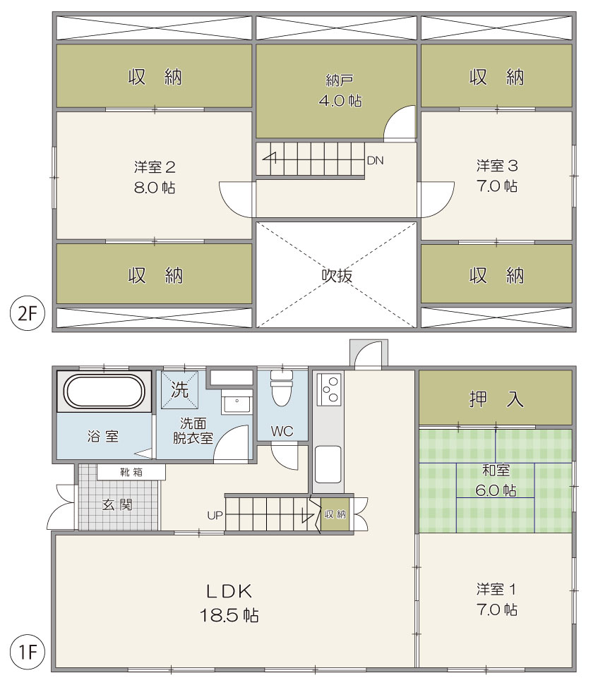 【間取り】1F:18.5帖,洋室7帖,和室6帖,洗面脱衣室,浴室,トイレ 2F:洋室8帖,洋室7帖,納戸4帖
